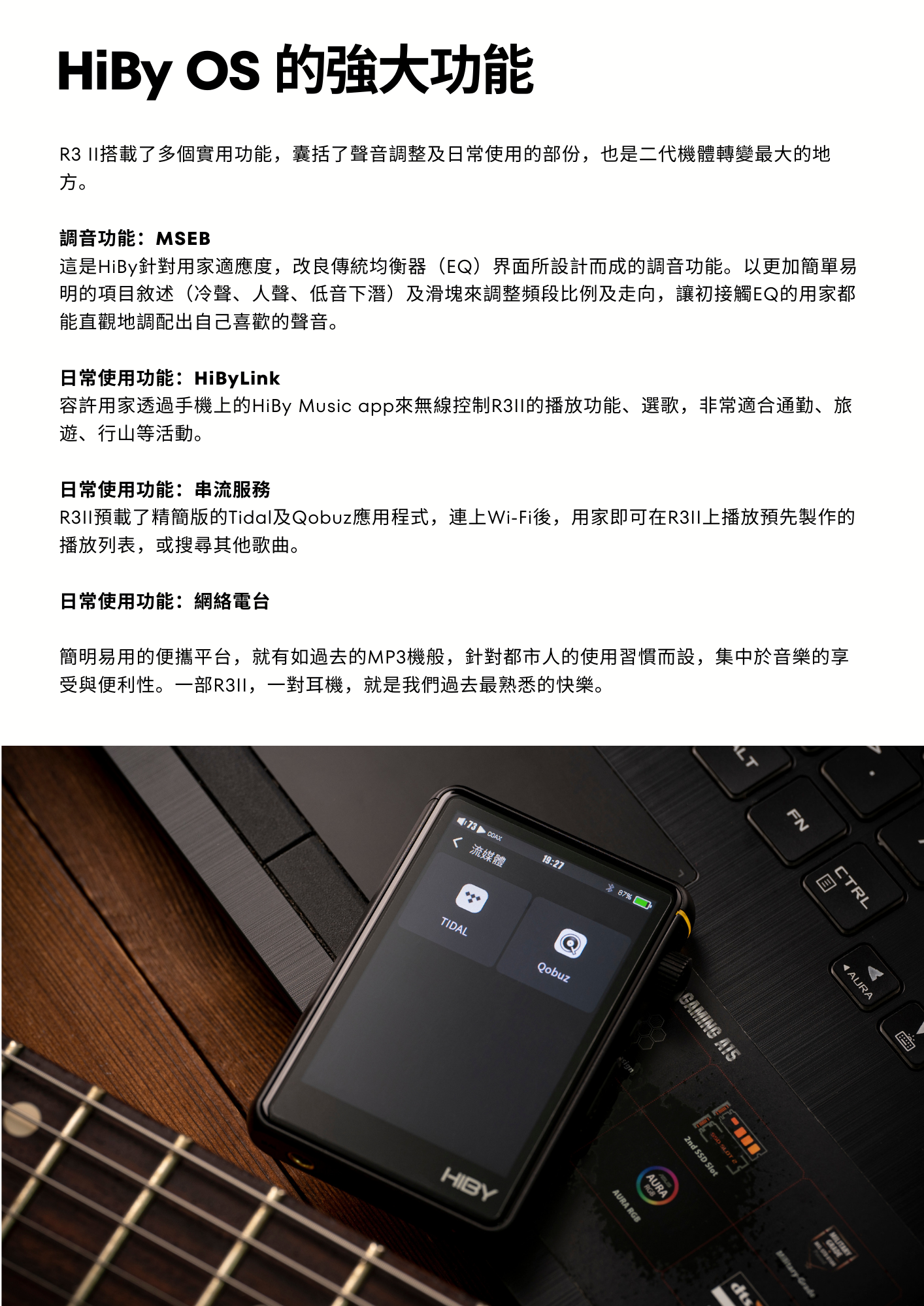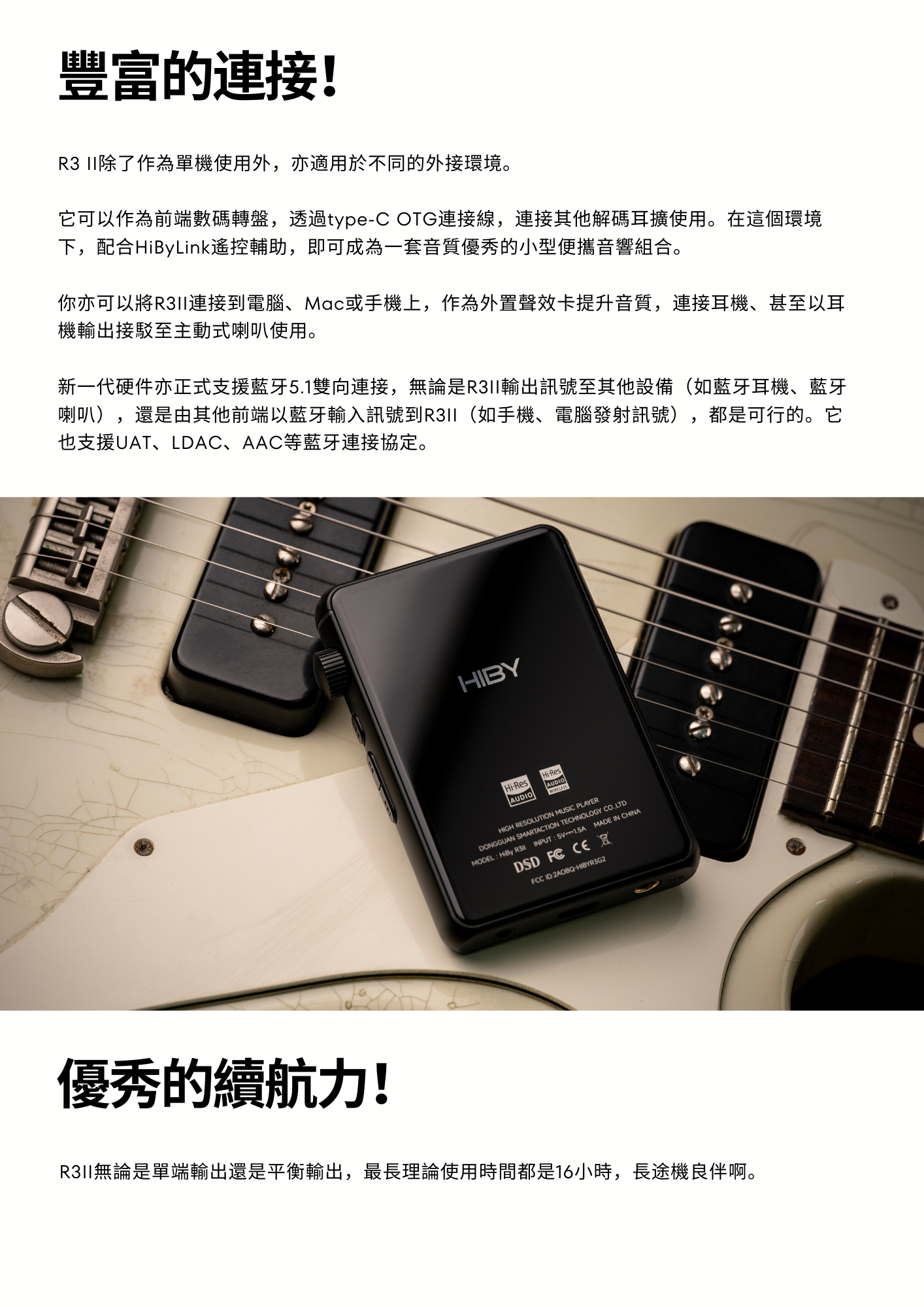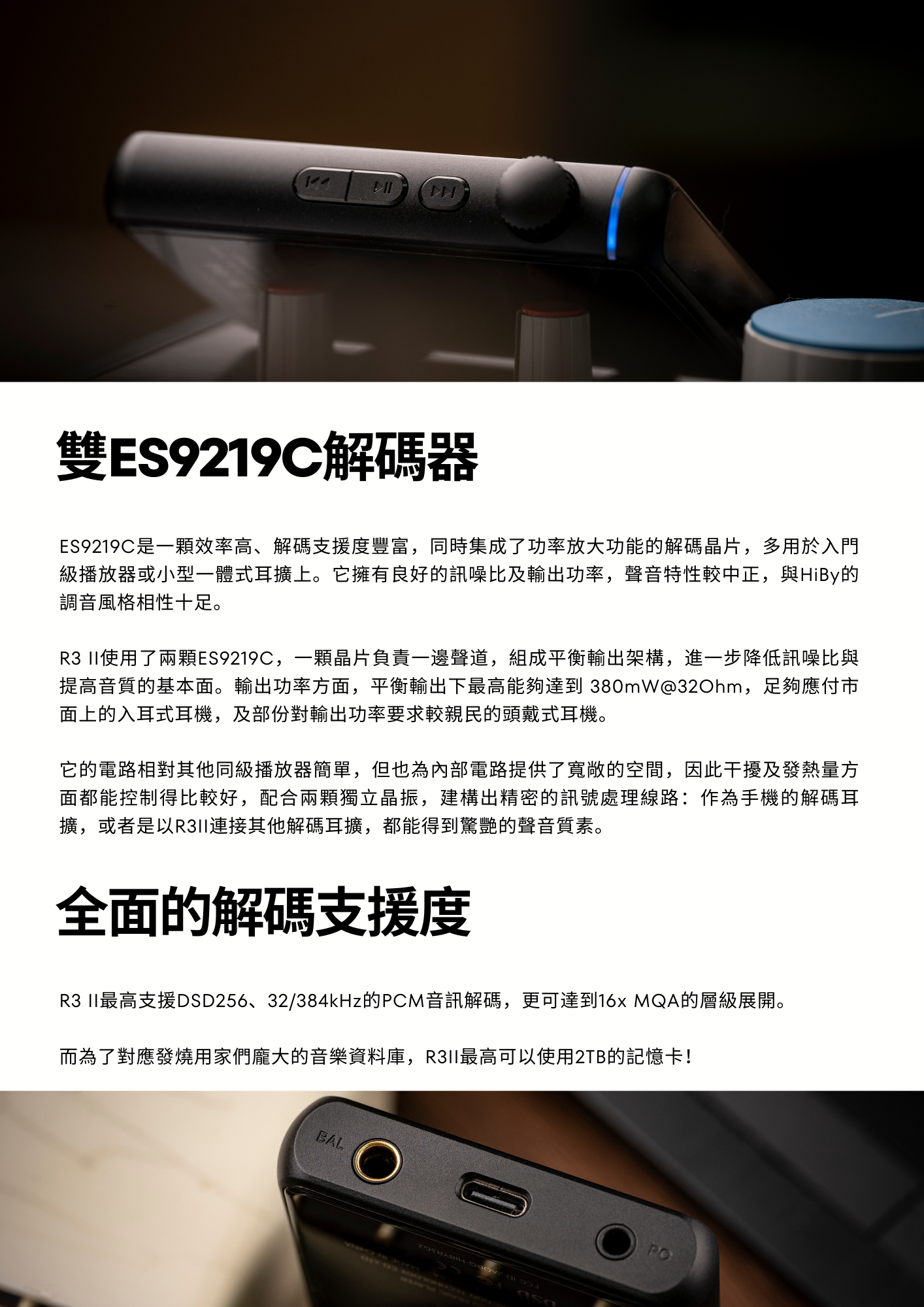 R3系列是HiBy最受歡迎的機體,全球總並售出約二十萬部,有著令人意想不到的性價比。來到R3 II,保持輕巧便攜的藍本,汎用性更高,採用雙ESS9219C組成平衡輸出電路,加上MSEB、HiByLink等以人為本的功能,為用家帶來良好的音質與方便的使用體驗。